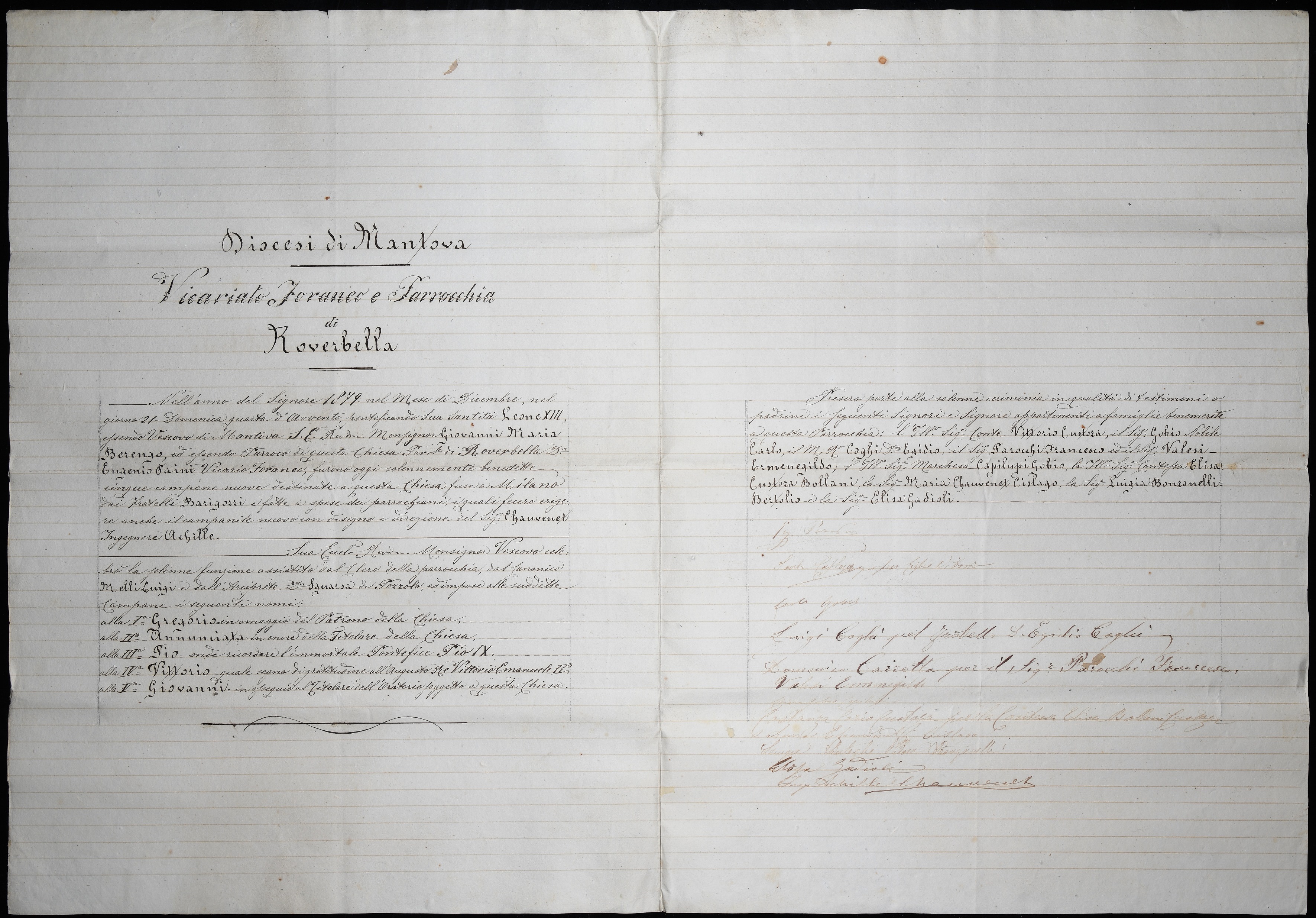 Domenica 21 dicembre 1879 ci fu la conseguente cerimonia pubblica presieduta dal nuovo vescovo di Mantova Mons. Giovanni Maria Berengo(4) della benedizione del concerto delle 5 nuove campane fatte costruire per l’occasione presso la fonderia dei fratelli Barigozzi(5) a Milano e prossime alla posa in opera.
